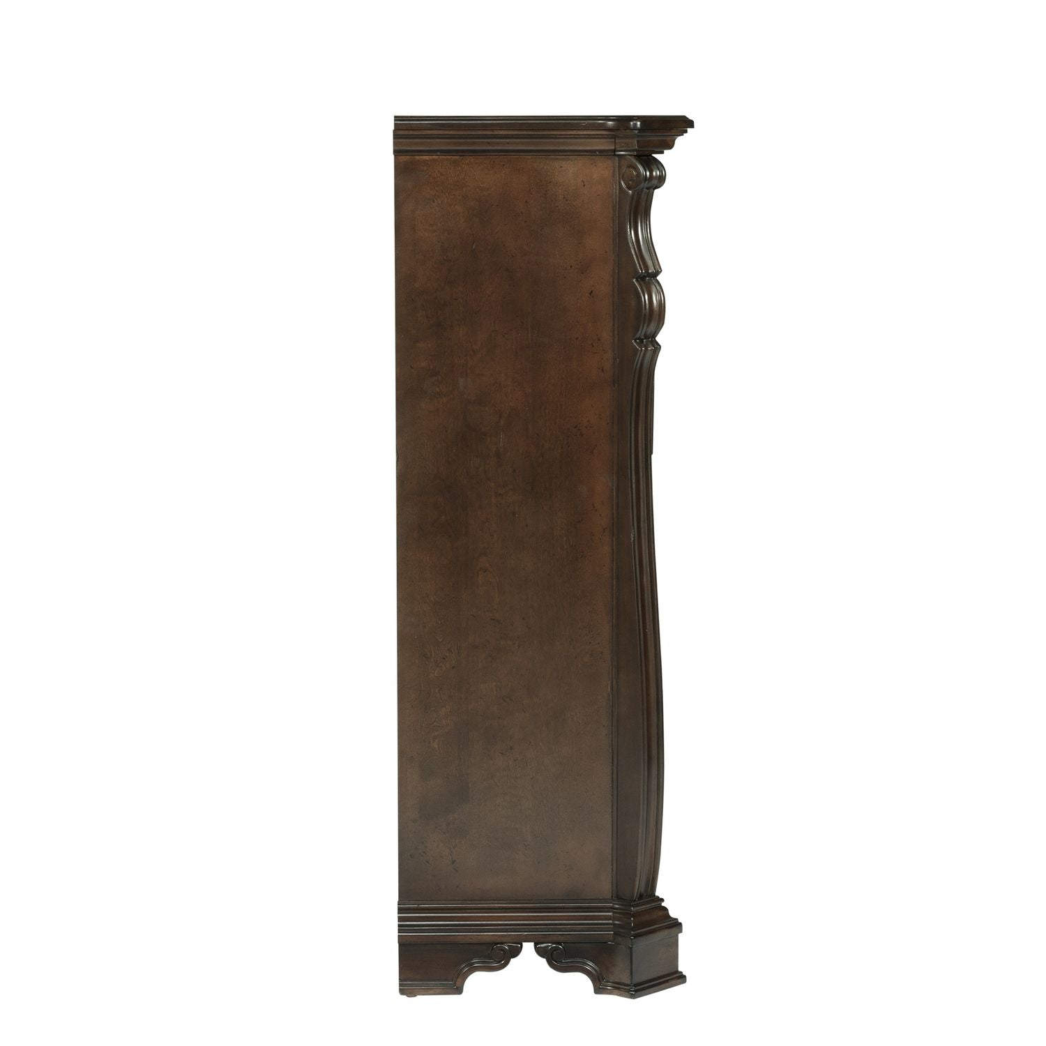 Add a statement piece to your room with the Arbor Place chest. Crafted with poplar solids,birch , birch veneers and metal, this piece features bottom case dust proofing, fully stained interior drawers and a felt lined top drawer. The brownstone finish is accented by burnished brass hardware as well as the four-way match fancy face top. Shaped pilasters create a subtle Bombay effect, highlighting the bold and remarkable scaling of the piece.