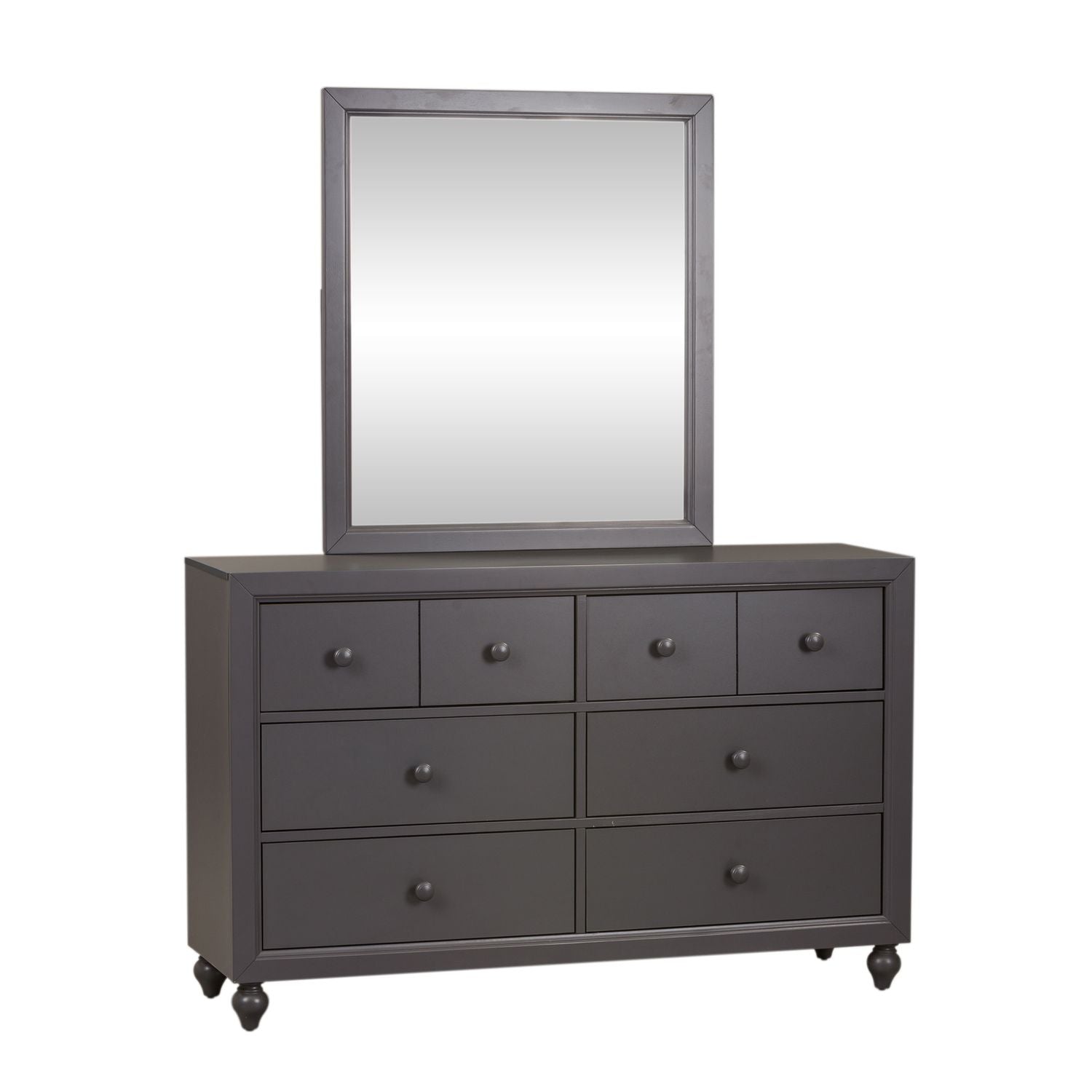 Bring in clean lines with the Cottage View twin panel bed, dresser, and mirror. Crafted of melamine and rubberwood solids, this kit features a dark gray finish, picture frame solid wood case moldings, bun feet, bluff-cut top drawers, and is accented with wooden knob hardware. The panel bed features square posts with round finials along with slat overlays. The dresser features six drawers and pairs nicely with the beveled edge mirror that can be attached with the included bolt-on supports. With cottage design always in fashion, make the Cottage View a part of your home.