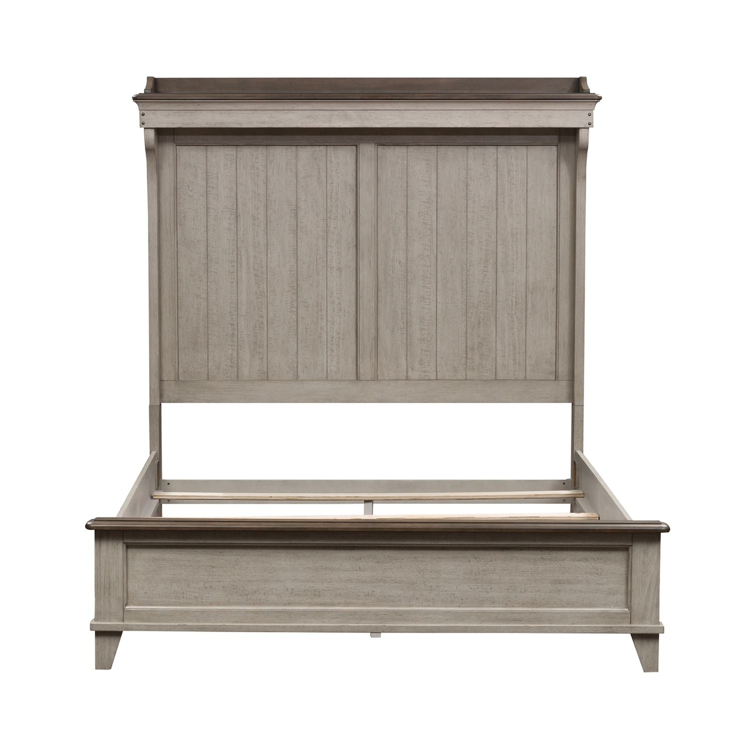 Create a relaxing retreat with the Ivy Hollow queen mantle bed. Crafted of poplar solids with pine and alder veneers, this bed features a heavily distressed weathered linen and dusty taupe finish with saw marks. The headboard has a shaped mantle crown with a gallery top and touch LED lighting illuminating planked panels. The panel footboard features a cap rail finished in dusty taupe that combines nicely with the weathered linen finish. With the bolt-on rails and center support slat system, this bed is sure to last. Inviting and inspirational, Ivy Hollow offers the farmhouse look and design style that works for cottage or contemporary and is more about creating a look that we love.