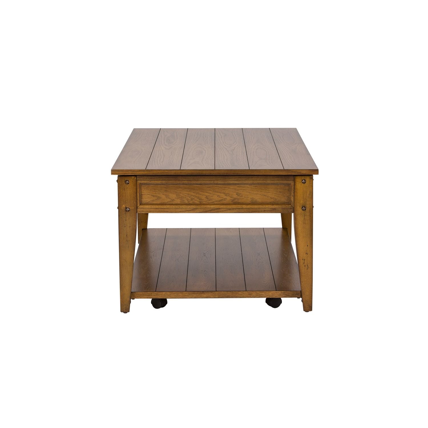 Enjoy family game night around the Lake House lift top cocktail table. Crafted of poplar solids and oak veneers, this piece features an oak finish, appealing planked top that can be lifted and extend up to 30", one planked bottom shelf, wood and peg accents, two storage cubies underneath the lift top, casters for easy moveability, anchored by a tapered leg design. The golden oak finish allows for a universal appeal.