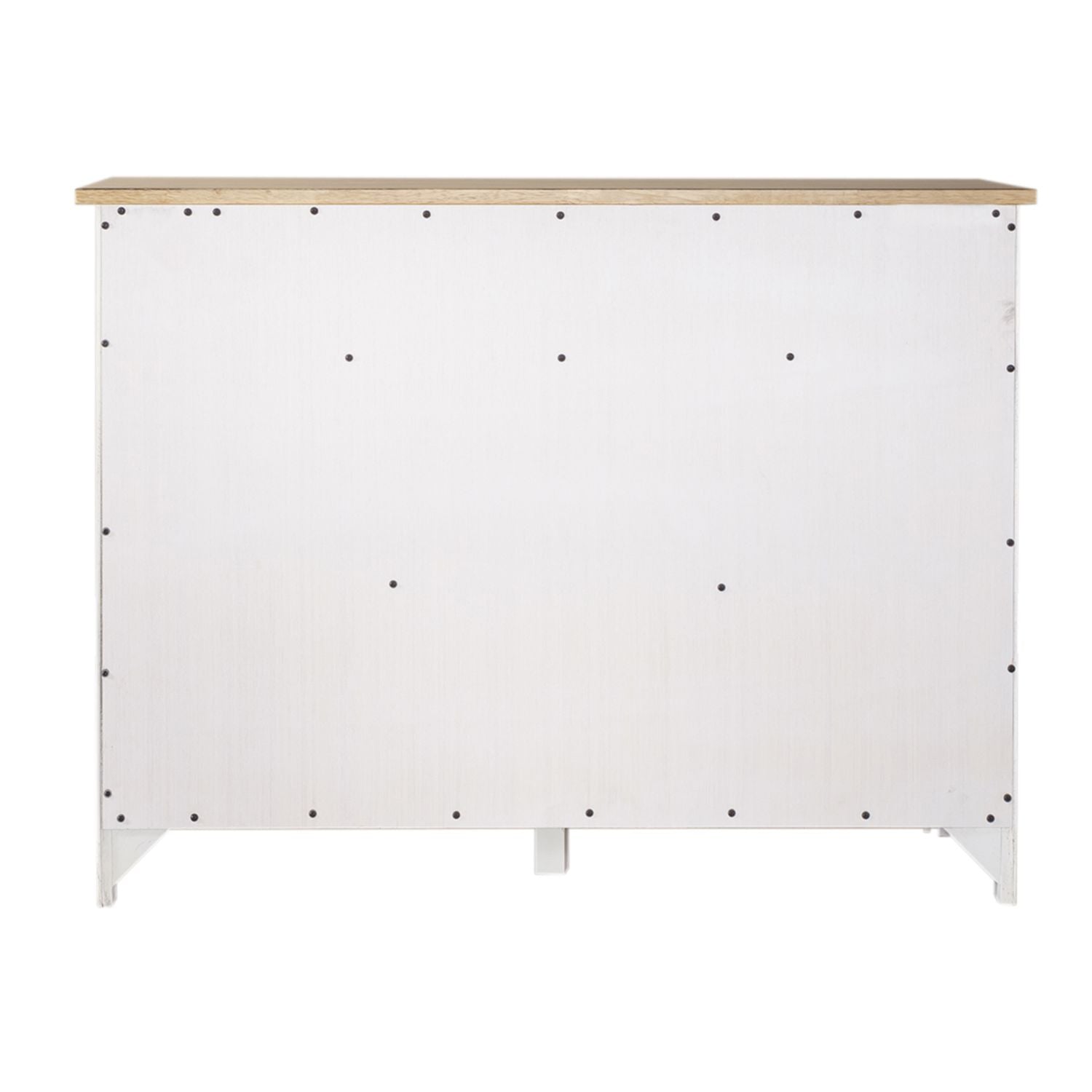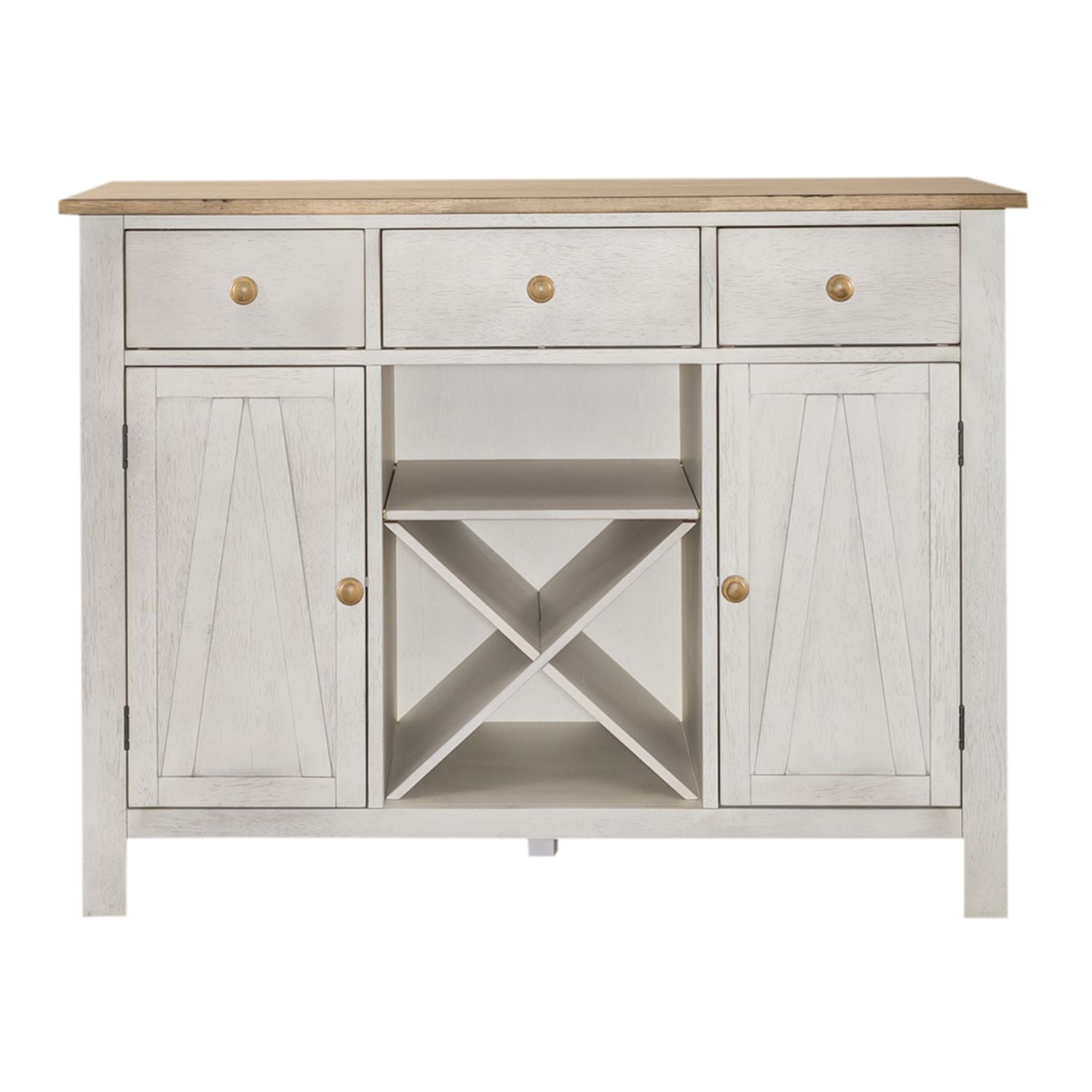Invite a classic look with a casual feel into your home with the Lindsey Farm server. Crafted of rubberwood solids and veneers with MDF, this piece features a weathered white and sandstone finish, inverted v design on both doors, levelers to protect your flooring and adjust the height, three drawers accented with gray wood knob hardware, one adjustable shelf behind each door, and removeable x shaped wine shelving. This piece has an alternate finish and offers a look that compliments today's homes with style uncompromised.