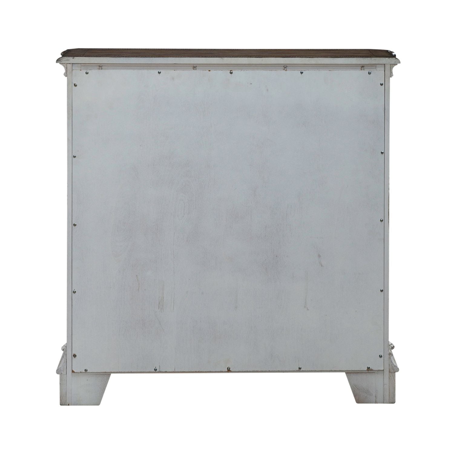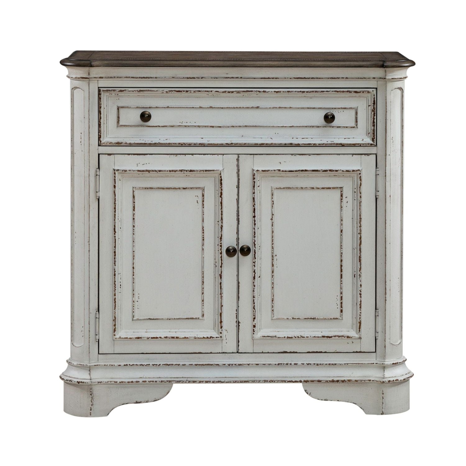 The Magnolia Manor accent cabinet exudes timeless charm and functionality, boasting meticulous craftsmanship and elegant detailing. Crafted with care, the accent cabinet is constructed of Rubberwood solids with White Oak and Birch veneers. Its distinguished façade showcases two doors framed with intricate bead molding, creating a sophisticated focal point. Enhanced with Antique Pewter knob hardware, each detail exudes vintage allure and refinement. Adding to its allure are the canted corners and softly rounded chamfered pilasters, which gracefully accentuate the cabinet's silhouette. The inclusion of shaped bracket feet not only lends stability but also elevates its aesthetic appeal, exuding a sense of sophistication. Practicality meets style with the Magnolia Manor Accent Cabinet, as it offers ample storage space within. A convenient drawer and one adjustable wood shelf behind the set of doors provide versatile storage solutions, perfect for stowing away essentials while maintaining easy accessibility. Whether placed in the living room, bedroom, or hallway, this accent cabinet serves as a statement piece, elevating the ambiance of any space with its timeless elegance and functional design. Imbue your home with charm and sophistication with the Magnolia Manor Accent Cabinet, a testament to exceptional craftsmanship and enduring style.