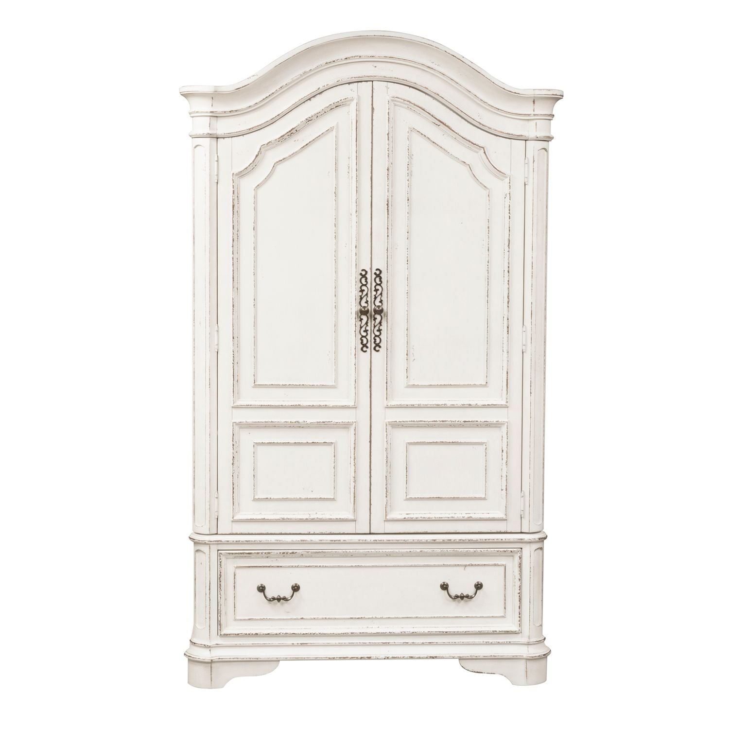 Accent your bedroom with the perfect blend of European Traditional design, using this unique and stylish armoire. The all over antique white finish accompanied by heavy chipping sets this piece apart from the rest of the collection. Two beautiful wrap around doors open to reveal a multi-functional space, including removable shelves and a clothing rail. The wire management cut outs enable this piece to double as a tv console, optimizing space in your room.