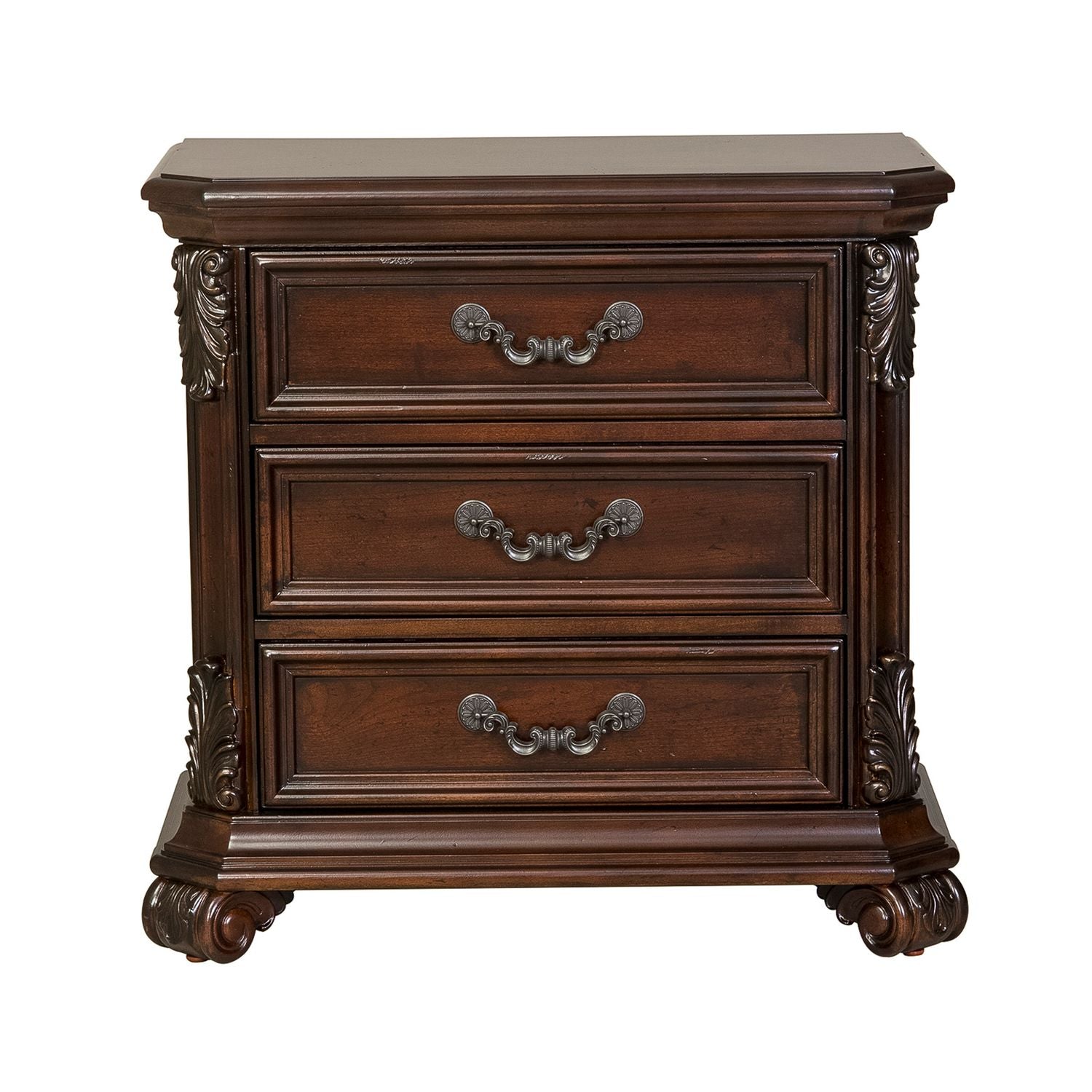 Enhance any room with this luxurious Messina Estates 3 drawer night stand while obtaining an elegant European style. Crafted with rubber wood solids and birch veneers, this piece features fully stained interior drawers, felt lined top drawers and beautifully detailed acanthus leaf overlays. The unique cognac finish paired with the rich detail throughout this piece is sure to make a statement in any bedroom.