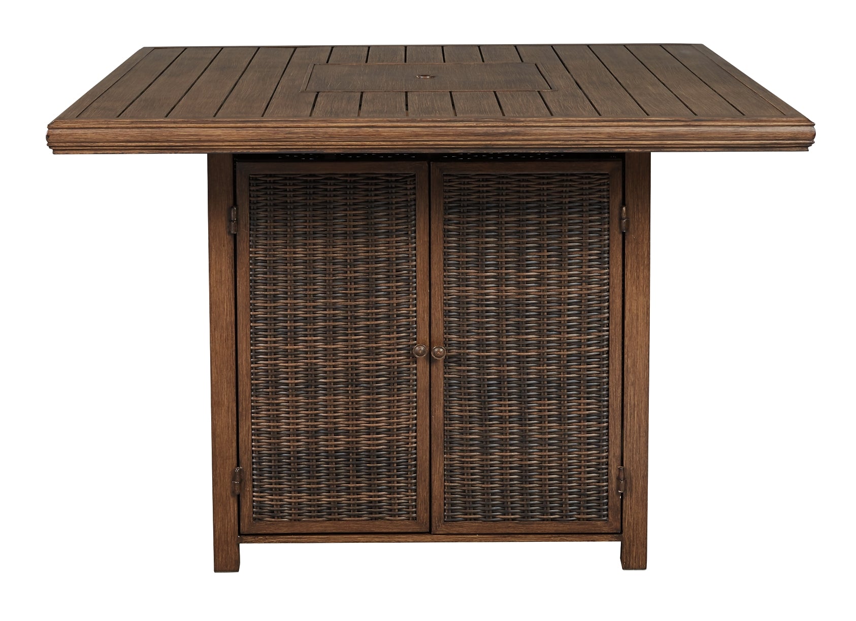 | Details | Accommodates up to 8; bar stools sold separately, Door conceals gas propane tank (not included), Rust-proof aluminum frame with wood-look tabletop, Side panels accented with all-weather, handwoven resin wicker, 56" square fire pit table with CSA-approved 55,000 BTU stainless steel burner, glass beads, burner cover and enclosed storage area with shelves, Battery-operated ignition system with adjustable flame control; battery included, Convertible to natural gas, Gas line or propane tank connector hose not provided, Assembly required, Comes with protective weather cover | |