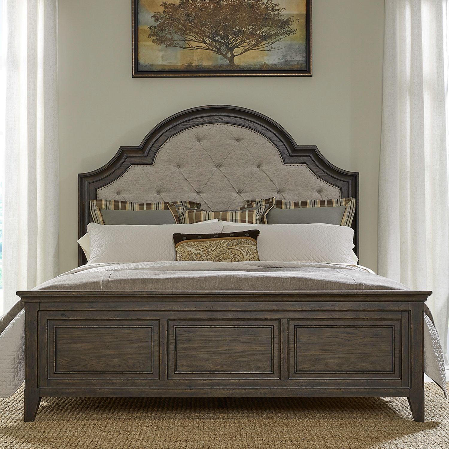 Built for beauty, strength, and durability, the Paradise Valley California King Upholstered bed was designed to last throughout the years and delight generations to come. Crafted with excellence using Rubberwood solids and Split Heart White Oak veneers, this bed features a Saddle Brown finish. The arched crown and sloped sides with chamfered pilasters on the headboard create beautiful shaping. The wood framed button tufted upholstered panel in a Flax Tweed fabric is accented by an Antique Pewter nail head trim. Framed panels trimmed with bead molding create a stunning accent to the panel footboard. Chamfered pilasters flow into square tapered feet. Heavy crown molding adds to the traditional feel and captures grand opulence with comfortable rustic styling.
