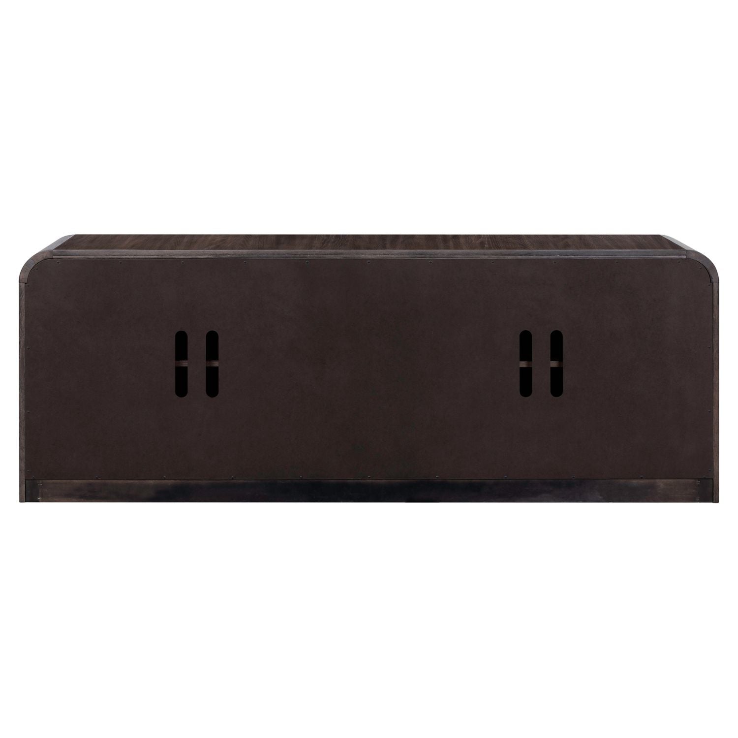 The Perspectives 82 inch TV console is the perfect blend of sophistication and functionality for your entertainment space. Meticulously crafted using Rubberwood solids and Split Heart White Oak veneers, this console features an Espresso finish. The console boasts soft shaping, highlighted by a gracefully rounded waterfall edge, adding a touch of elegance to any room. Designed for both style and convenience, the console features four flat cut doors adorned with Satin Nickel bar pull hardware, lending a modern yet timeless appeal. Behind each set of doors, you'll discover an adjustable wood shelf, providing ample storage to organize your media devices, gaming consoles, and more. Say goodbye to tangled wires and cluttered cables. With integrated wire management provisions, this console ensures your space remains tidy and organized, allowing you to enjoy seamless entertainment without the hassle of unsightly cords. Whether you're hosting a movie night with friends or simply unwinding with your favorite show, the Perspectives 82 inch TV console combines sleek design with practical functionality, elevating your viewing experience to new heights.