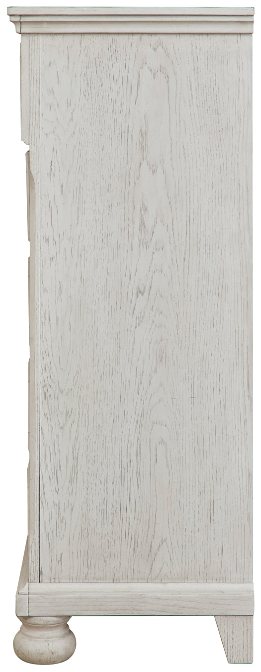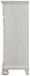 Elegant, timeless furnishings take your bedroom to the next level. Nothing does that better than this chest of drawers. The antiqued white finish with a wonderful grain texture radiates sophistication, while dark bronze-tone knobs add an ornate touch. Felt finishing in the upper drawers rounds out this tasteful piece.