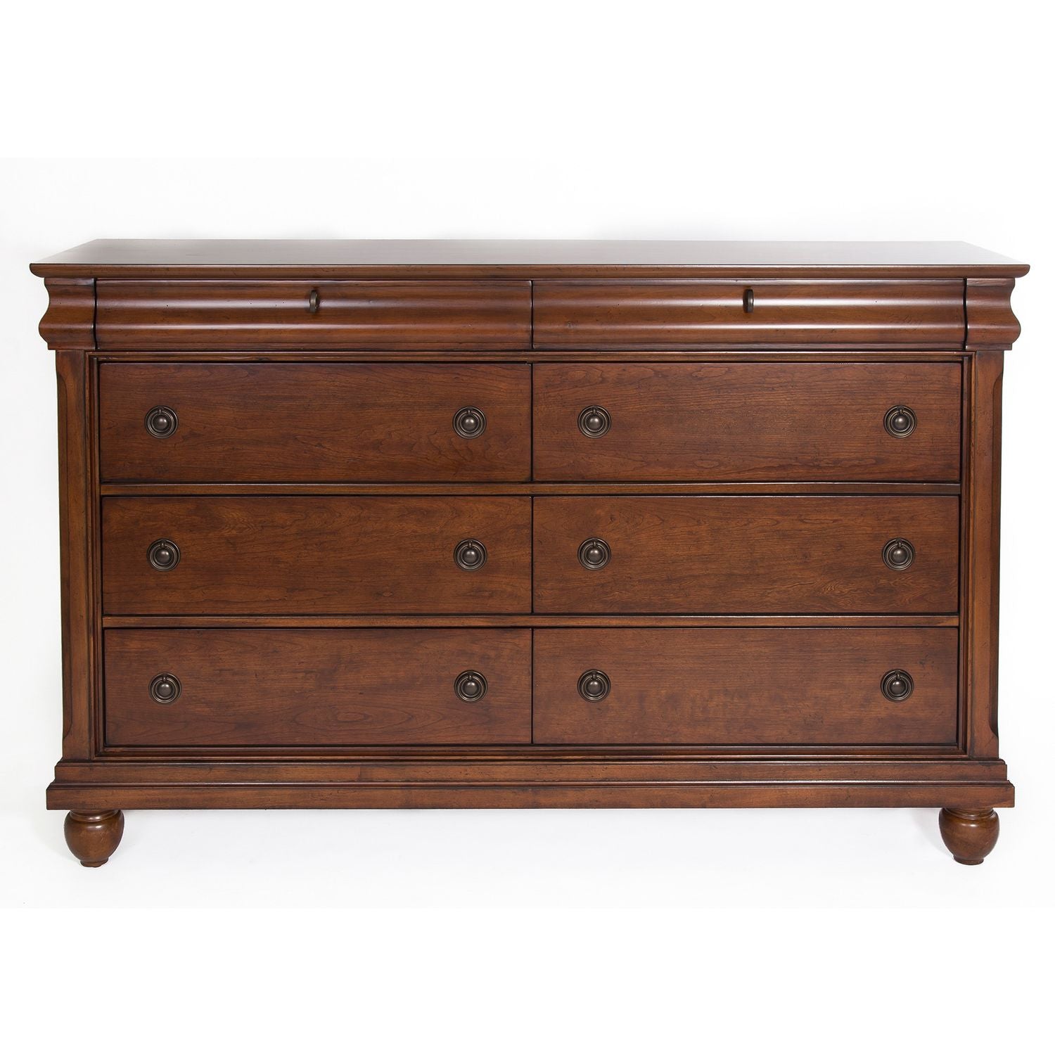 Achieve a casual traditional look with this 8-drawer dresser. The rustic cherry finish is attained through pin knotty cherry and a well-worn look. Organize your clothing using the 6 large drawers and 2 smaller drawers. The Louis Philippe style dresser features chamfered pilasters and bun feet, adding to the casual feel.