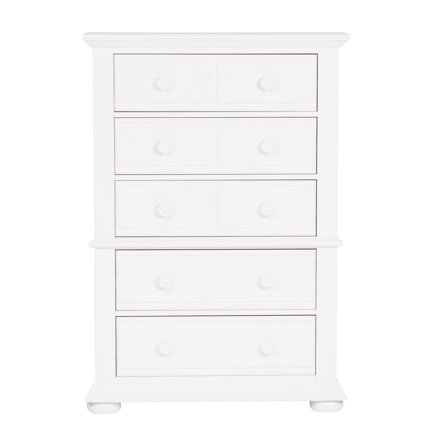 Obtain a fashionable cottage look with the summer house chest. Crafted with poplar and pine solids with wood products, this piece features 5 drawers, bottom case dust proofing, felt lined top drawers, and fully stained interior drawers. The oyster white finish is accented by wooden knob hardware.