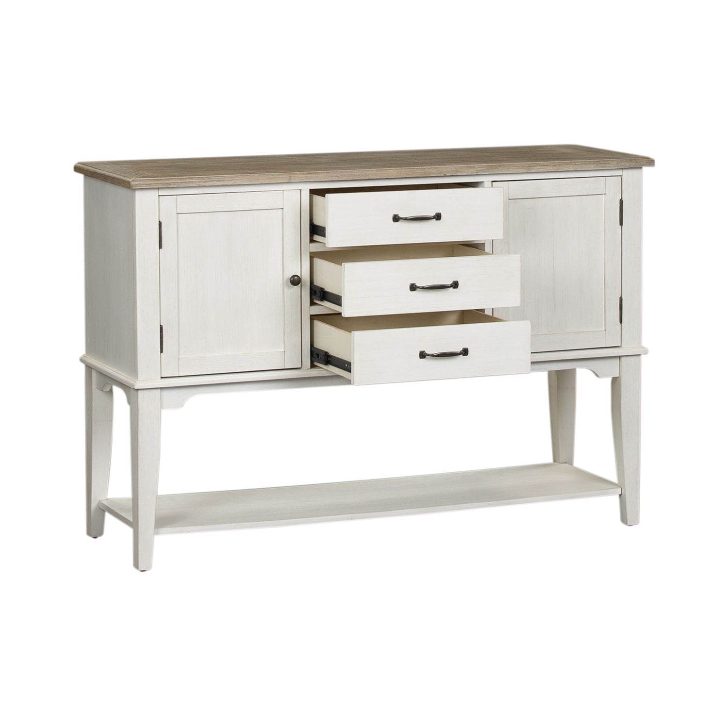 Enhance your space with the Summerville server. Crafted of rubberwood solids and pine veneers, this piece features a soft white wash finish with wire brushed gray tops, three full extension drawers for easy access to storage and the top drawer being felt lined, two doors with one adjustable shelf behind each door allowing for user customization, an open bottom shelf for display or extra storage, and is anchored by tapered legs. Summerville offers a combination of style and function.
